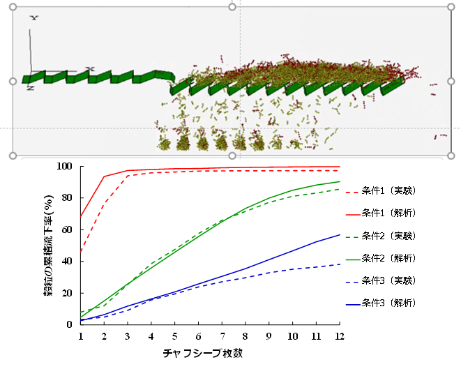 また,供試機の揺動選別部の構造を3D モデルとして構築し,実験を行った制御因子に基づく条件において、籾と藁屑の3D-DEM(個別要素法) による選別シミュレーションを実施し,実機による実験結果と比較検討しています.