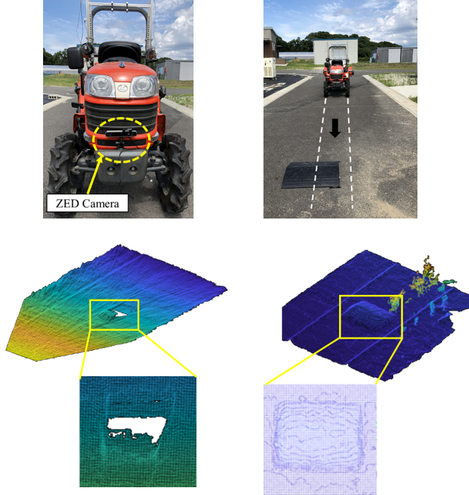 本研究では転倒安全性の向上を目的として、トラクタに設置したステレオビジョンカメラにより前方の走行路面の3次元再構築を試みております.さらに、再構成された突起物を踏む路面の起伏情報をトラクタの走行シミュレーションの入力として機体の挙動を解析し,実走行時の計測データとの比較・検証を行っています.